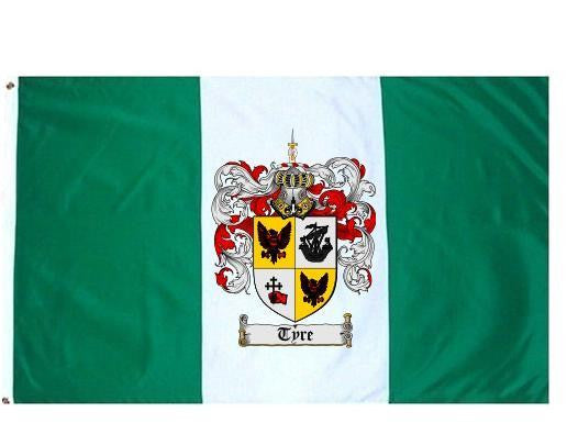 Tyre Family Crest Flag / Coat of Arms Flag. You will receive a high quality 3' x 5' Polyester flag with two brass grommets. Proudly display your family heritage with this flag, or hang as a banner on a wall. Our flags make great gifts for birthdays, weddings, anniversaries, fathers day, mothers day, groomsmen gifts, and any other occasion