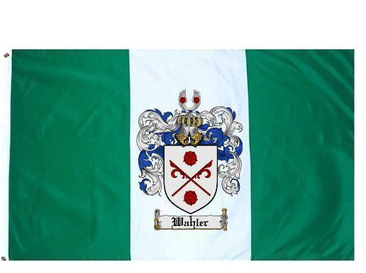 Wahler Family Crest Flag / Coat of Arms Flag. You will receive a high quality 3' x 5' Polyester flag with two brass grommets. Proudly display your family heritage with this flag, or hang as a banner on a wall. Our flags make great gifts for birthdays, weddings, anniversaries, fathers day, mothers day, groomsmen gifts, and any other occasion