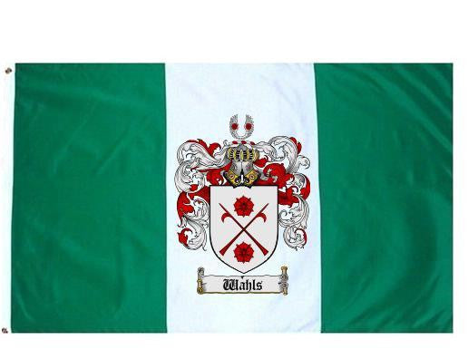 Wahls Family Crest Flag / Coat of Arms Flag. You will receive a high quality 3' x 5' Polyester flag with two brass grommets. Proudly display your family heritage with this flag, or hang as a banner on a wall. Our flags make great gifts for birthdays, weddings, anniversaries, fathers day, mothers day, groomsmen gifts, and any other occasion