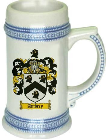 Ambrey Family Crest Stein / Coat of Arms Beer Tankard. We believe our Coat of Arms Steins are of the highest quality anywhere. The glassware quality is very thick and sturdy. The stein feels great in your hand with a very thick handle. Fill this glass with your favorite beer or beverage. keywords: steins, beer, german, glass, glassware, cup, tankard, goblet, family shields, shield, family, genealogy, heraldry, code of arms