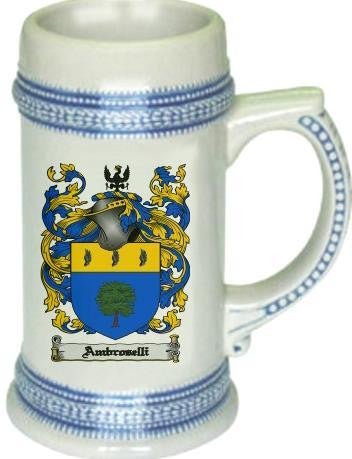 Ambroselli Family Crest Stein / Coat of Arms Beer Tankard. We believe our Coat of Arms Steins are of the highest quality anywhere. The glassware quality is very thick and sturdy. The stein feels great in your hand with a very thick handle. Fill this glass with your favorite beer or beverage. keywords: steins, beer, german, glass, glassware, cup, tankard, goblet, family shields, shield, family, genealogy, heraldry, code of arms