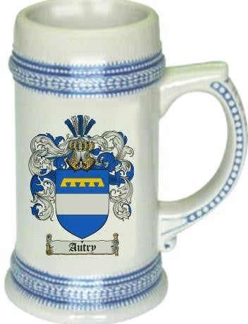 Autry Family Crest Stein / Coat of Arms Beer Tankard. We believe our Coat of Arms Steins are of the highest quality anywhere. The glassware quality is very thick and sturdy. The stein feels great in your hand with a very thick handle. Fill this glass with your favorite beer or beverage. keywords: steins, beer, german, glass, glassware, cup, tankard, goblet, family shields, shield, family, genealogy, heraldry, code of arms