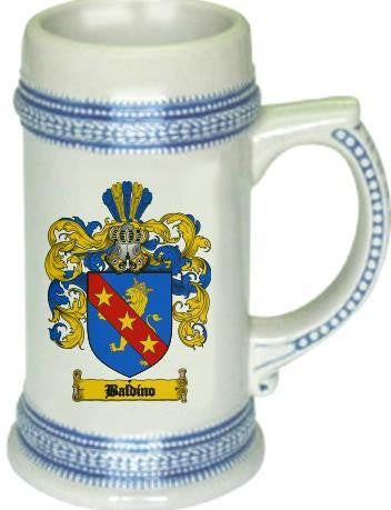 Baldino Family Crest Stein / Coat of Arms Beer Tankard. We believe our Coat of Arms Steins are of the highest quality anywhere. The glassware quality is very thick and sturdy. The stein feels great in your hand with a very thick handle. Fill this glass with your favorite beer or beverage. keywords: steins, beer, german, glass, glassware, cup, tankard, goblet, family shields, shield, family, genealogy, heraldry, code of arms