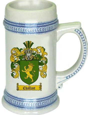 Chalfant Family Crest Stein / Coat of Arms Beer Tankard. We believe our Coat of Arms Steins are of the highest quality anywhere. The glassware quality is very thick and sturdy. The stein feels great in your hand with a very thick handle. Fill this glass with your favorite beer or beverage. keywords: steins, beer, german, glass, glassware, cup, tankard, goblet, family shields, shield, family, genealogy, heraldry, code of arms