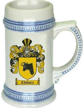 Chmura Family Crest Stein / Coat of Arms Beer Tankard. We believe our Coat of Arms Steins are of the highest quality anywhere. The glassware quality is very thick and sturdy. The stein feels great in your hand with a very thick handle. Fill this glass with your favorite beer or beverage. keywords: steins, beer, german, glass, glassware, cup, tankard, goblet, family shields, shield, family, genealogy, heraldry, code of arms