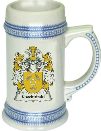 Chocimirski Family Crest Stein / Coat of Arms Beer Tankard. We believe our Coat of Arms Steins are of the highest quality anywhere. The glassware quality is very thick and sturdy. The stein feels great in your hand with a very thick handle. Fill this glass with your favorite beer or beverage. keywords: steins, beer, german, glass, glassware, cup, tankard, goblet, family shields, shield, family, genealogy, heraldry, code of arms