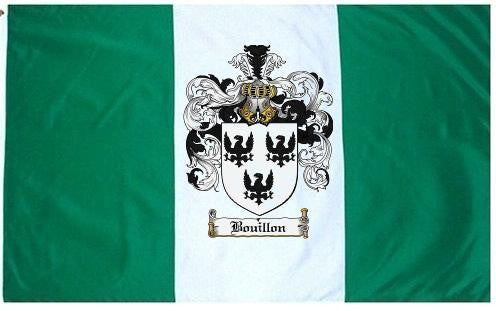 Bouillon Family Crest Flag / Coat of Arms Flag. You will receive a high quality 3' x 5' Polyester flag with two brass grommets. Proudly display your family heritage with this flag, or hang as a banner on a wall. Our flags make great gifts for birthdays, weddings, anniversaries, fathers day, mothers day, groomsmen gifts, and any other occasion