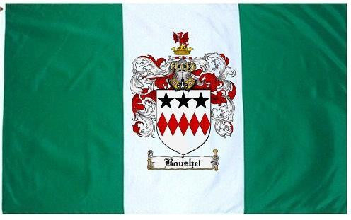 Boushel Family Crest Flag / Coat of Arms Flag. You will receive a high quality 3' x 5' Polyester flag with two brass grommets. Proudly display your family heritage with this flag, or hang as a banner on a wall. Our flags make great gifts for birthdays, weddings, anniversaries, fathers day, mothers day, groomsmen gifts, and any other occasion