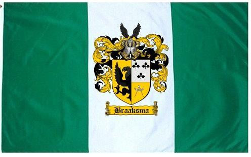 Braaksma Family Crest Flag / Coat of Arms Flag. You will receive a high quality 3' x 5' Polyester flag with two brass grommets. Proudly display your family heritage with this flag, or hang as a banner on a wall. Our flags make great gifts for birthdays, weddings, anniversaries, fathers day, mothers day, groomsmen gifts, and any other occasion