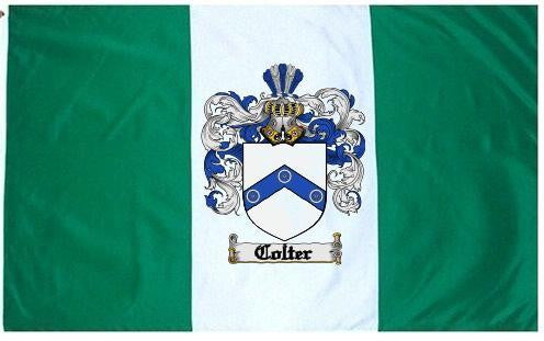 Colter Family Crest Flag / Coat of Arms Flag. You will receive a high quality 3' x 5' Polyester flag with two brass grommets. Proudly display your family heritage with this flag, or hang as a banner on a wall. Our flags make great gifts for birthdays, weddings, anniversaries, fathers day, mothers day, groomsmen gifts, and any other occasion