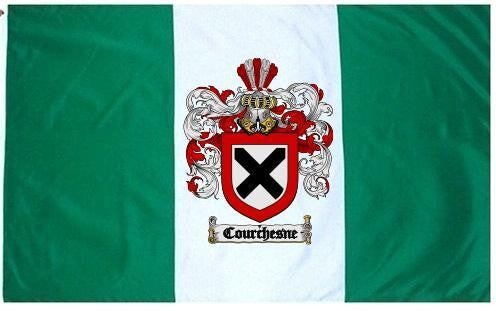 Courchesne Family Crest Flag / Coat of Arms Flag. You will receive a high quality 3' x 5' Polyester flag with two brass grommets. Proudly display your family heritage with this flag, or hang as a banner on a wall. Our flags make great gifts for birthdays, weddings, anniversaries, fathers day, mothers day, groomsmen gifts, and any other occasion