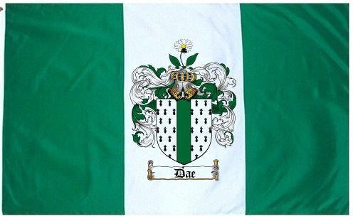 Dae Family Crest Flag / Coat of Arms Flag. You will receive a high quality 3' x 5' Polyester flag with two brass grommets. Proudly display your family heritage with this flag, or hang as a banner on a wall. Our flags make great gifts for birthdays, weddings, anniversaries, fathers day, mothers day, groomsmen gifts, and any other occasion