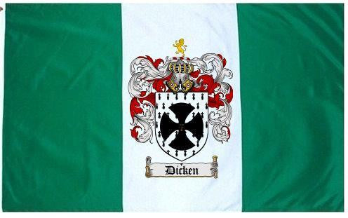 Dicken Family Crest Flag / Coat of Arms Flag. You will receive a high quality 3' x 5' Polyester flag with two brass grommets. Proudly display your family heritage with this flag, or hang as a banner on a wall. Our flags make great gifts for birthdays, weddings, anniversaries, fathers day, mothers day, groomsmen gifts, and any other occasion