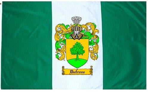 Dufrene Family Crest Flag / Coat of Arms Flag. You will receive a high quality 3' x 5' Polyester flag with two brass grommets. Proudly display your family heritage with this flag, or hang as a banner on a wall. Our flags make great gifts for birthdays, weddings, anniversaries, fathers day, mothers day, groomsmen gifts, and any other occasion