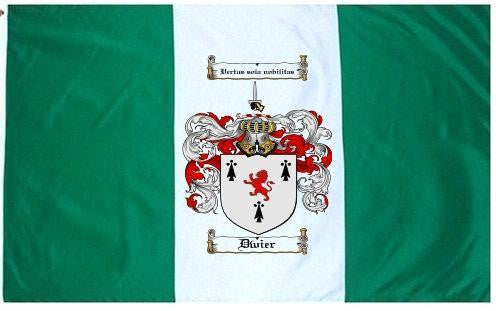 Dwier Family Crest Flag / Coat of Arms Flag. You will receive a high quality 3' x 5' Polyester flag with two brass grommets. Proudly display your family heritage with this flag, or hang as a banner on a wall. Our flags make great gifts for birthdays, weddings, anniversaries, fathers day, mothers day, groomsmen gifts, and any other occasion
