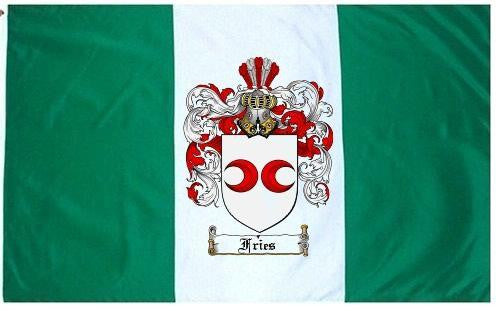 Fries Family Crest Flag / Coat of Arms Flag. You will receive a high quality 3' x 5' Polyester flag with two brass grommets. Proudly display your family heritage with this flag, or hang as a banner on a wall. Our flags make great gifts for birthdays, weddings, anniversaries, fathers day, mothers day, groomsmen gifts, and any other occasion