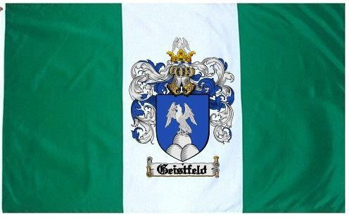 Geistfeld Family Crest Flag / Coat of Arms Flag. You will receive a high quality 3' x 5' Polyester flag with two brass grommets. Proudly display your family heritage with this flag, or hang as a banner on a wall. Our flags make great gifts for birthdays, weddings, anniversaries, fathers day, mothers day, groomsmen gifts, and any other occasion