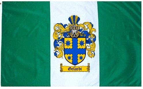 Gelardi Family Crest Flag / Coat of Arms Flag. You will receive a high quality 3' x 5' Polyester flag with two brass grommets. Proudly display your family heritage with this flag, or hang as a banner on a wall. Our flags make great gifts for birthdays, weddings, anniversaries, fathers day, mothers day, groomsmen gifts, and any other occasion