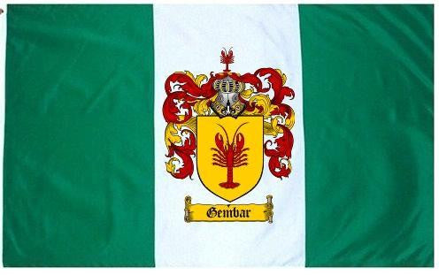 Gembar Family Crest Flag / Coat of Arms Flag. You will receive a high quality 3' x 5' Polyester flag with two brass grommets. Proudly display your family heritage with this flag, or hang as a banner on a wall. Our flags make great gifts for birthdays, weddings, anniversaries, fathers day, mothers day, groomsmen gifts, and any other occasion