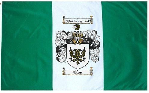 Glyn Family Crest Flag / Coat of Arms Flag. You will receive a high quality 3' x 5' Polyester flag with two brass grommets. Proudly display your family heritage with this flag, or hang as a banner on a wall. Our flags make great gifts for birthdays, weddings, anniversaries, fathers day, mothers day, groomsmen gifts, and any other occasion