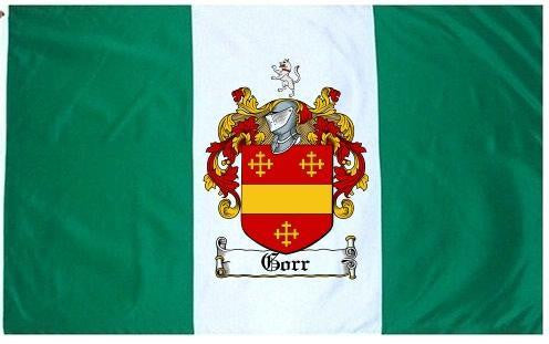 Gorr Family Crest Flag / Coat of Arms Flag. You will receive a high quality 3' x 5' Polyester flag with two brass grommets. Proudly display your family heritage with this flag, or hang as a banner on a wall. Our flags make great gifts for birthdays, weddings, anniversaries, fathers day, mothers day, groomsmen gifts, and any other occasion