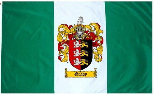 Grady Family Crest Flag / Coat of Arms Flag. You will receive a high quality 3' x 5' Polyester flag with two brass grommets. Proudly display your family heritage with this flag, or hang as a banner on a wall. Our flags make great gifts for birthdays, weddings, anniversaries, fathers day, mothers day, groomsmen gifts, and any other occasion