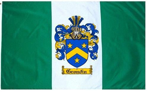 Grondin Family Crest Flag / Coat of Arms Flag. You will receive a high quality 3' x 5' Polyester flag with two brass grommets. Proudly display your family heritage with this flag, or hang as a banner on a wall. Our flags make great gifts for birthdays, weddings, anniversaries, fathers day, mothers day, groomsmen gifts, and any other occasion