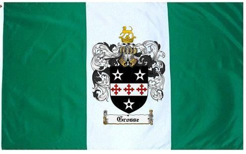 Grosse Family Crest Flag / Coat of Arms Flag. You will receive a high quality 3' x 5' Polyester flag with two brass grommets. Proudly display your family heritage with this flag, or hang as a banner on a wall. Our flags make great gifts for birthdays, weddings, anniversaries, fathers day, mothers day, groomsmen gifts, and any other occasion