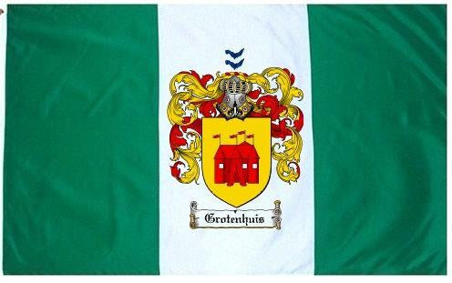 Grotenhuis Family Crest Flag / Coat of Arms Flag. You will receive a high quality 3' x 5' Polyester flag with two brass grommets. Proudly display your family heritage with this flag, or hang as a banner on a wall. Our flags make great gifts for birthdays, weddings, anniversaries, fathers day, mothers day, groomsmen gifts, and any other occasion