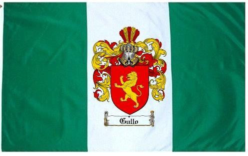Gullo Family Crest Flag / Coat of Arms Flag. You will receive a high quality 3' x 5' Polyester flag with two brass grommets. Proudly display your family heritage with this flag, or hang as a banner on a wall. Our flags make great gifts for birthdays, weddings, anniversaries, fathers day, mothers day, groomsmen gifts, and any other occasion