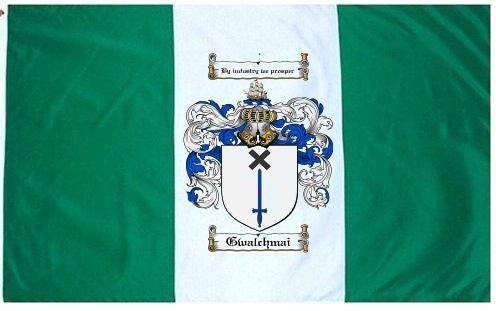 Gwalchmai Family Crest Flag / Coat of Arms Flag. You will receive a high quality 3' x 5' Polyester flag with two brass grommets. Proudly display your family heritage with this flag, or hang as a banner on a wall. Our flags make great gifts for birthdays, weddings, anniversaries, fathers day, mothers day, groomsmen gifts, and any other occasion