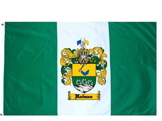 Hedman Family Crest Flag / Coat of Arms Flag. You will receive a high quality 3' x 5' Polyester flag with two brass grommets. Proudly display your family heritage with this flag, or hang as a banner on a wall. Our flags make great gifts for birthdays, weddings, anniversaries, fathers day, mothers day, groomsmen gifts, and any other occasion