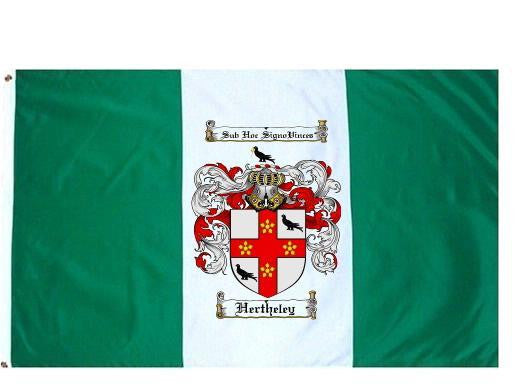 Hertheley Family Crest Flag / Coat of Arms Flag. You will receive a high quality 3' x 5' Polyester flag with two brass grommets. Proudly display your family heritage with this flag, or hang as a banner on a wall. Our flags make great gifts for birthdays, weddings, anniversaries, fathers day, mothers day, groomsmen gifts, and any other occasion