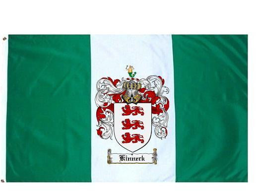 Kinnerk Family Crest Flag / Coat of Arms Flag. You will receive a high quality 3' x 5' Polyester flag with two brass grommets. Proudly display your family heritage with this flag, or hang as a banner on a wall. Our flags make great gifts for birthdays, weddings, anniversaries, fathers day, mothers day, groomsmen gifts, and any other occasion