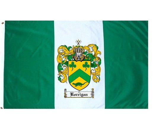 Korrigan Family Crest Flag / Coat of Arms Flag. You will receive a high quality 3' x 5' Polyester flag with two brass grommets. Proudly display your family heritage with this flag, or hang as a banner on a wall. Our flags make great gifts for birthdays, weddings, anniversaries, fathers day, mothers day, groomsmen gifts, and any other occasion
