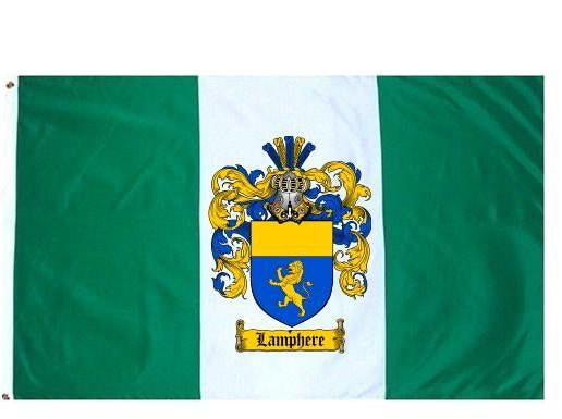 Lamphere Family Crest Flag / Coat of Arms Flag. You will receive a high quality 3' x 5' Polyester flag with two brass grommets. Proudly display your family heritage with this flag, or hang as a banner on a wall. Our flags make great gifts for birthdays, weddings, anniversaries, fathers day, mothers day, groomsmen gifts, and any other occasion