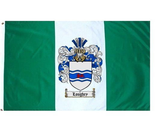 Loughry Family Crest Flag / Coat of Arms Flag. You will receive a high quality 3' x 5' Polyester flag with two brass grommets. Proudly display your family heritage with this flag, or hang as a banner on a wall. Our flags make great gifts for birthdays, weddings, anniversaries, fathers day, mothers day, groomsmen gifts, and any other occasion