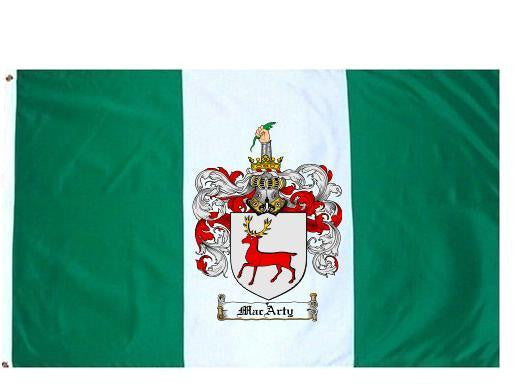 Macarty Family Crest Flag / Coat of Arms Flag. You will receive a high quality 3' x 5' Polyester flag with two brass grommets. Proudly display your family heritage with this flag, or hang as a banner on a wall. Our flags make great gifts for birthdays, weddings, anniversaries, fathers day, mothers day, groomsmen gifts, and any other occasion