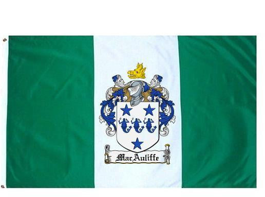 Macauliffe Family Crest Flag / Coat of Arms Flag. You will receive a high quality 3' x 5' Polyester flag with two brass grommets. Proudly display your family heritage with this flag, or hang as a banner on a wall. Our flags make great gifts for birthdays, weddings, anniversaries, fathers day, mothers day, groomsmen gifts, and any other occasion