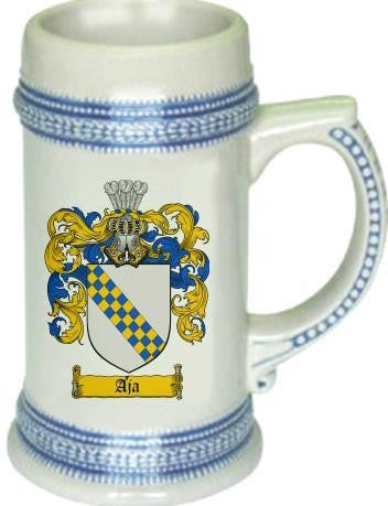 Aja Family Crest Stein / Coat of Arms Beer Tankard. We believe our Coat of Arms Steins are of the highest quality anywhere. The glassware quality is very thick and sturdy. The stein feels great in your hand with a very thick handle. Fill this glass with your favorite beer or beverage. keywords: steins, beer, german, glass, glassware, cup, tankard, goblet, family shields, shield, family, genealogy, heraldry, code of arms