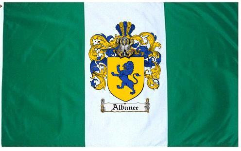 Albanee Family Crest Flag / Coat of Arms Flag. You will receive a high quality 3' x 5' Polyester flag with two brass grommets. Proudly display your family heritage with this flag, or hang as a banner on a wall. Our flags make great gifts for birthdays, weddings, anniversaries, fathers day, mothers day, groomsmen gifts, and any other occasion