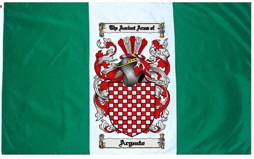 Argento Family Crest Flag / Coat of Arms Flag. You will receive a high quality 3' x 5' Polyester flag with two brass grommets. Proudly display your family heritage with this flag, or hang as a banner on a wall. Our flags make great gifts for birthdays, weddings, anniversaries, fathers day, mothers day, groomsmen gifts, and any other occasion