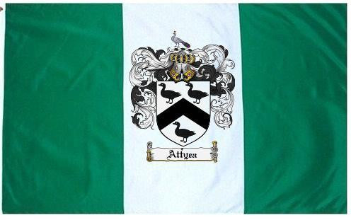 Attyea Family Crest Flag / Coat of Arms Flag. You will receive a high quality 3' x 5' Polyester flag with two brass grommets. Proudly display your family heritage with this flag, or hang as a banner on a wall. Our flags make great gifts for birthdays, weddings, anniversaries, fathers day, mothers day, groomsmen gifts, and any other occasion