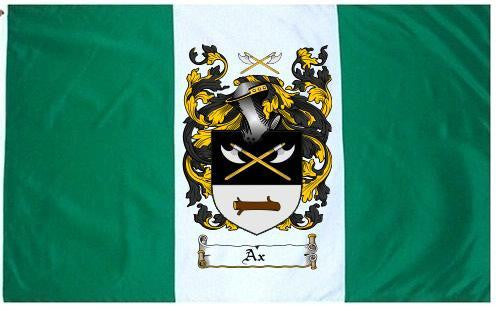 Ax Family Crest Flag / Coat of Arms Flag. You will receive a high quality 3' x 5' Polyester flag with two brass grommets. Proudly display your family heritage with this flag, or hang as a banner on a wall. Our flags make great gifts for birthdays, weddings, anniversaries, fathers day, mothers day, groomsmen gifts, and any other occasion