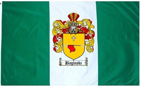 Baginski Family Crest Flag / Coat of Arms Flag. You will receive a high quality 3' x 5' Polyester flag with two brass grommets. Proudly display your family heritage with this flag, or hang as a banner on a wall. Our flags make great gifts for birthdays, weddings, anniversaries, fathers day, mothers day, groomsmen gifts, and any other occasion