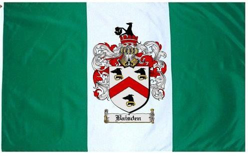 Baisden Family Crest Flag / Coat of Arms Flag. You will receive a high quality 3' x 5' Polyester flag with two brass grommets. Proudly display your family heritage with this flag, or hang as a banner on a wall. Our flags make great gifts for birthdays, weddings, anniversaries, fathers day, mothers day, groomsmen gifts, and any other occasion