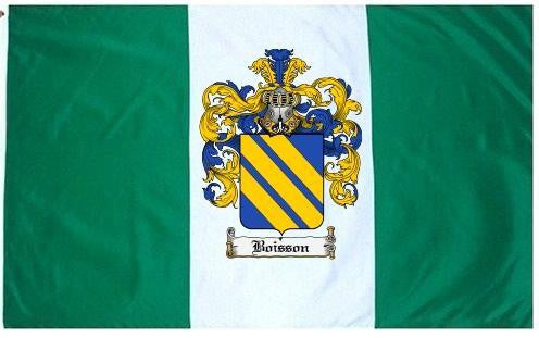 Boisson Family Crest Flag / Coat of Arms Flag. You will receive a high quality 3' x 5' Polyester flag with two brass grommets. Proudly display your family heritage with this flag, or hang as a banner on a wall. Our flags make great gifts for birthdays, weddings, anniversaries, fathers day, mothers day, groomsmen gifts, and any other occasion