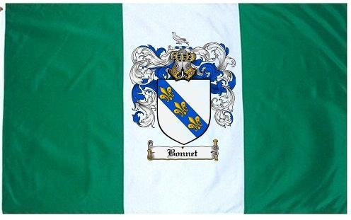 Bonnet Family Crest Flag / Coat of Arms Flag. You will receive a high quality 3' x 5' Polyester flag with two brass grommets. Proudly display your family heritage with this flag, or hang as a banner on a wall. Our flags make great gifts for birthdays, weddings, anniversaries, fathers day, mothers day, groomsmen gifts, and any other occasion