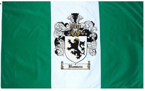 Busson Family Crest Flag / Coat of Arms Flag. You will receive a high quality 3' x 5' Polyester flag with two brass grommets. Proudly display your family heritage with this flag, or hang as a banner on a wall. Our flags make great gifts for birthdays, weddings, anniversaries, fathers day, mothers day, groomsmen gifts, and any other occasion