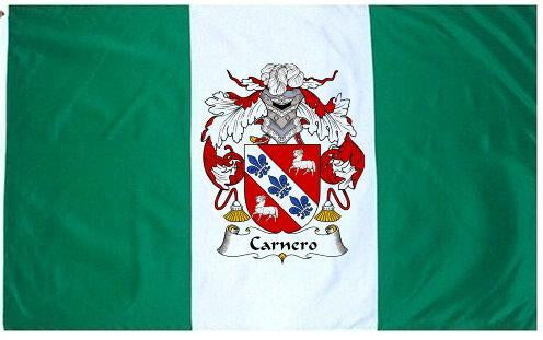 Carnero Family Crest Flag / Coat of Arms Flag. You will receive a high quality 3' x 5' Polyester flag with two brass grommets. Proudly display your family heritage with this flag, or hang as a banner on a wall. Our flags make great gifts for birthdays, weddings, anniversaries, fathers day, mothers day, groomsmen gifts, and any other occasion